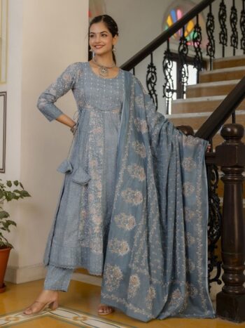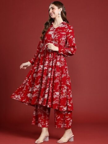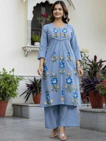 Floral Printed Bell Sleeves Thread Work Pure Cotton A-Line Kurta With Palazzos