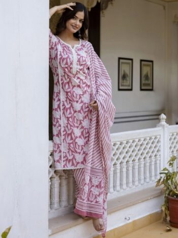 Pink Floral Printed Straight Thread Work Pure Cotton Kurta with Trousers & Dupatta