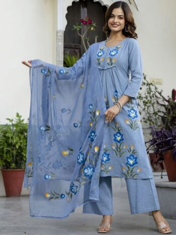 Floral Embroidered Regular Thread Work Pure Cotton Kurta with Trouser & Dupatta