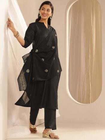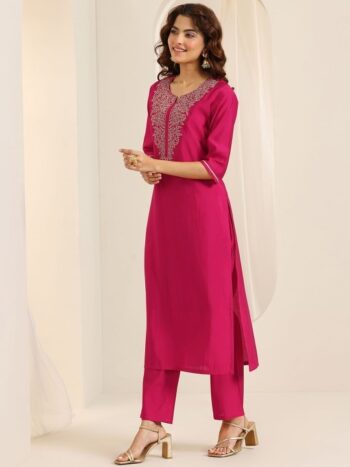 Round Neck Yoke Design Sequinned Straight Kurta with Trouser & Dupatta
