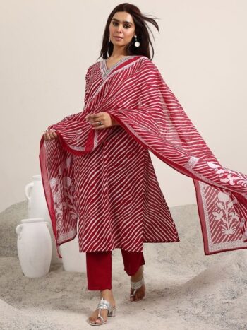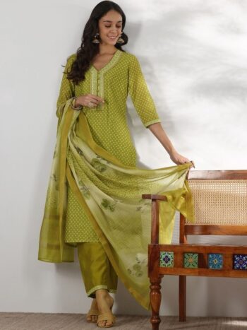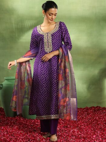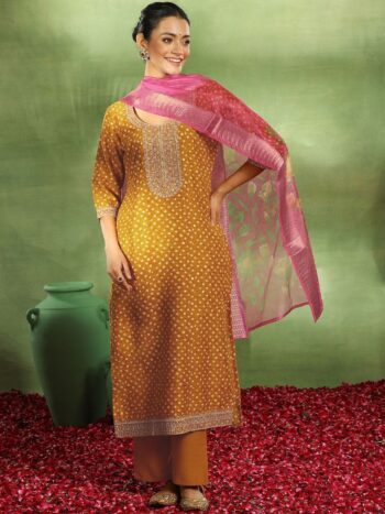 Bandhani Embroidered Sequinned Straight Kurta With Trouser & Dupatta