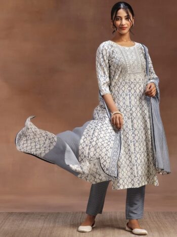 Ethnic Motifs Printed Thread Work Anarkali Kurta With Churidar & Dupatta