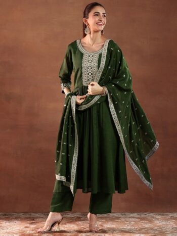 Green and Silver Floral Zari Yoke Design Pleated A-Line Kurta with Trouser & Dupatta