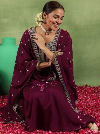 Burgundy Ethnic Motifs Yoke Design Pleated Sequinned Kurta with Trouser & Dupatta