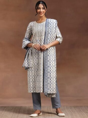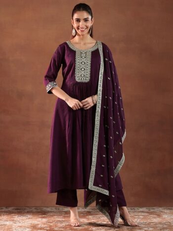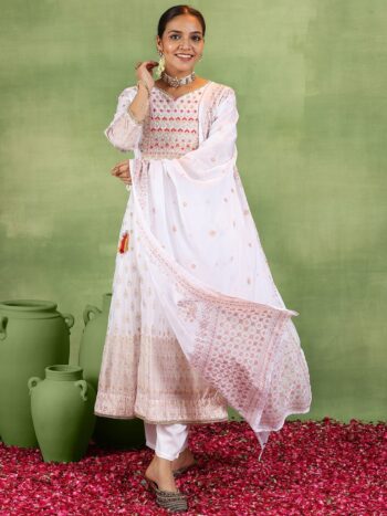 Ethnic Motifs Printed Thread Work Anarkali Kurta With Churidar & Dupatta