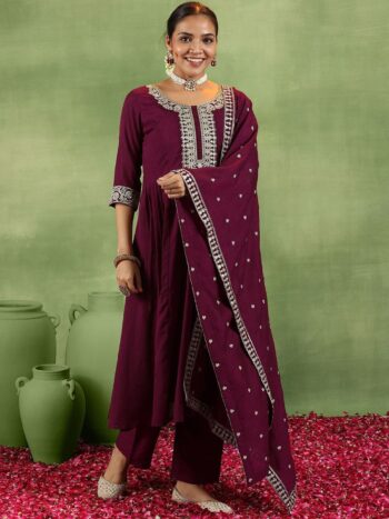 Burgundy Ethnic Motifs Yoke Design Pleated Sequinned Kurta with Trouser & Dupatta