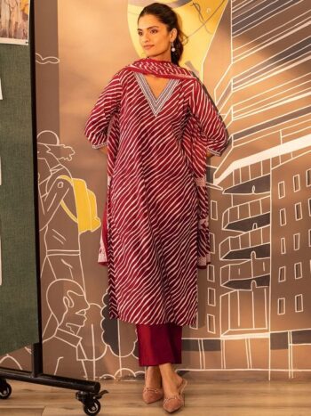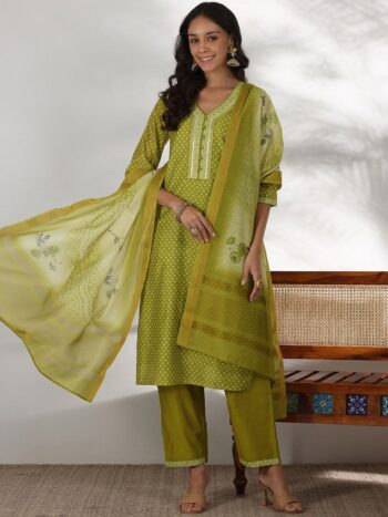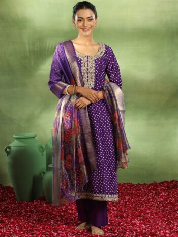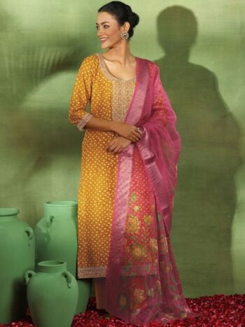Bandhani Embroidered Sequinned Straight Kurta With Trouser & Dupatta