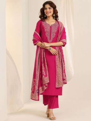 Round Neck Yoke Design Sequinned Straight Kurta with Trouser & Dupatta