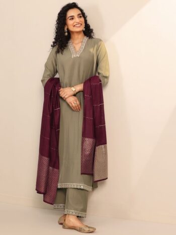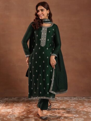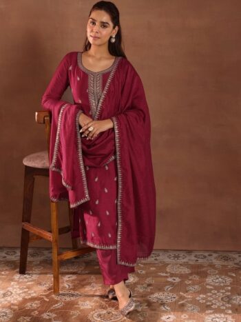 Floral Embroidered Sequinned Straight Kurta With Trousers & Dupatta