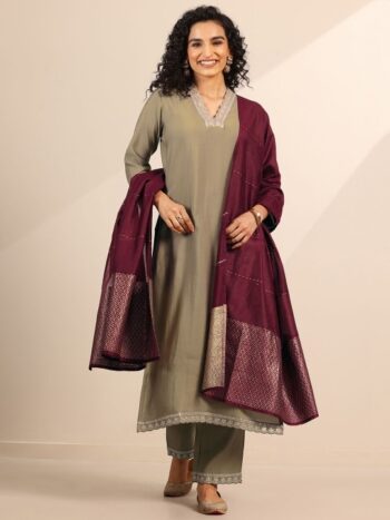 V-Neck Thread Work Straight Kurta With Trousers And Dupatta