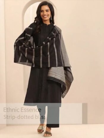 Black Mandarin Collar Straight Kurta with Trousers & With Dupatta