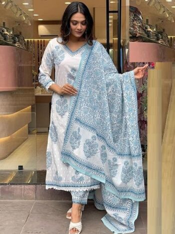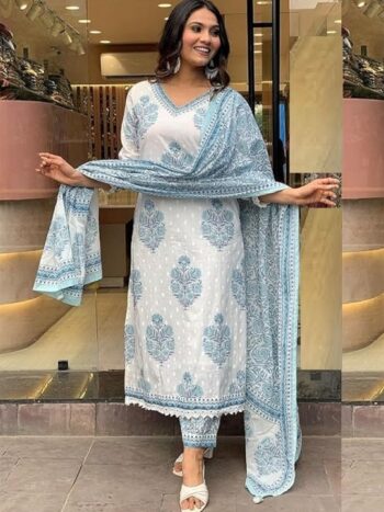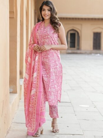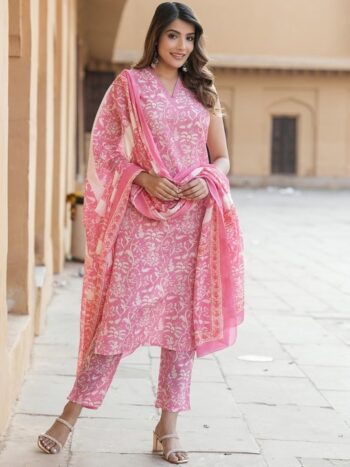 Floral Printed V-Neck Straight Kurta With Trousers And Dupatta