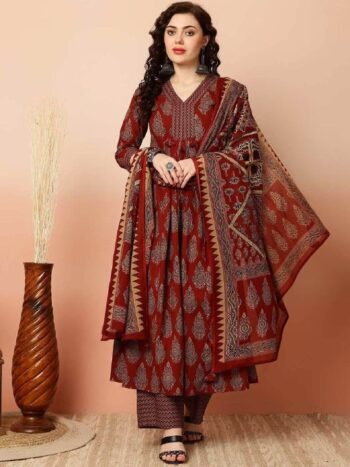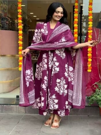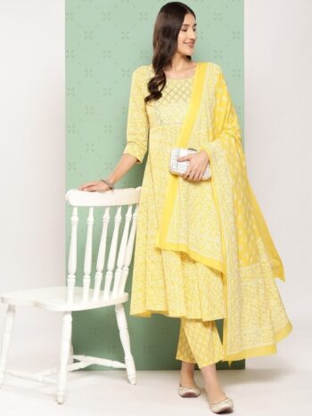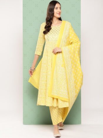 Ethnic Motifs Printed Pure Cotton Anarkali Kurta with Trousers & Dupatta