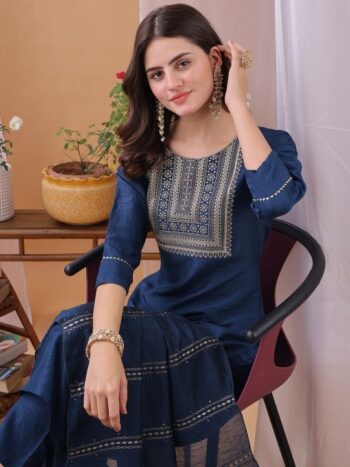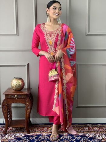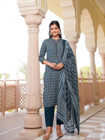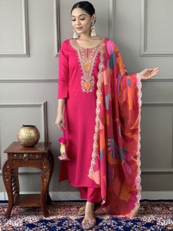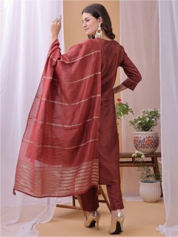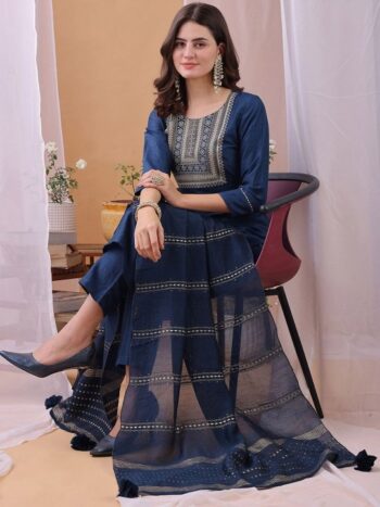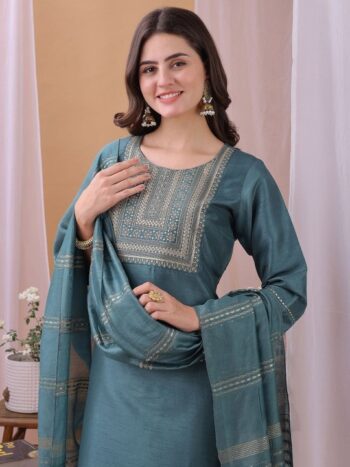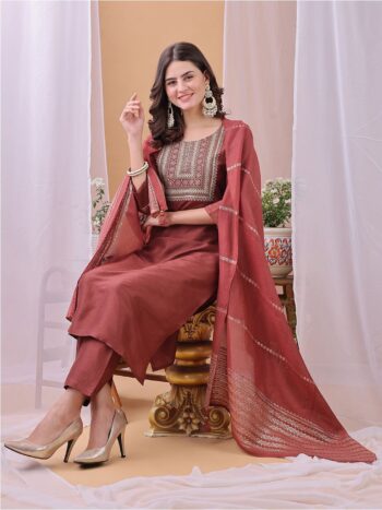 Ethnic Motifs Embroidered Round Neck Straight Kurta with Trouser & Dupatta