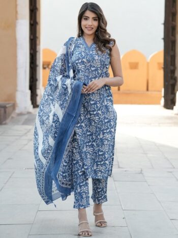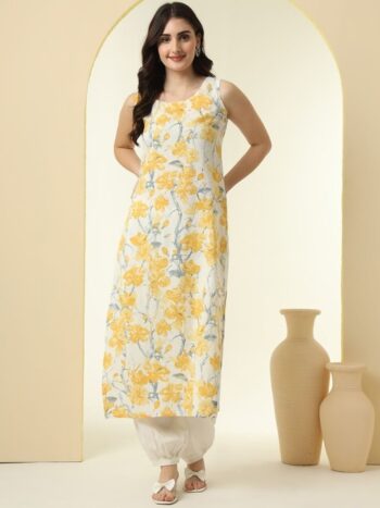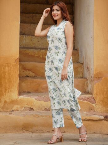 Floral Printed Sleeveless Pure Cotton Straight Kurta With Trouser