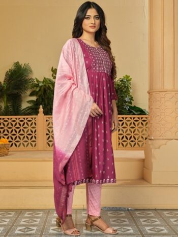 Floral Embroidered Thread Work Kurta & Trousers With Dupatta