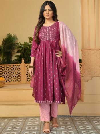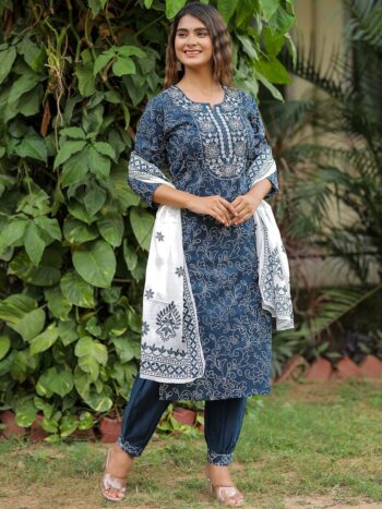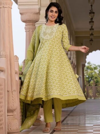 Floral Printed Mirror Work Anarkali Pure Cotton Kurta With Trousers & Dupatta