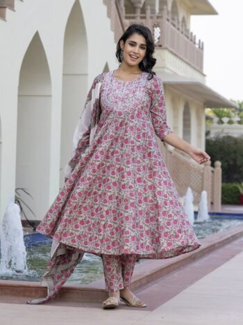 Floral Printed Notch Neck Anarkali Pure Cotton Kurta With Trousers And Dupatta