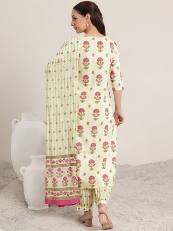 Off White Floral Printed Keyhole Neck Straight Kurta With Salwar & Dupatta