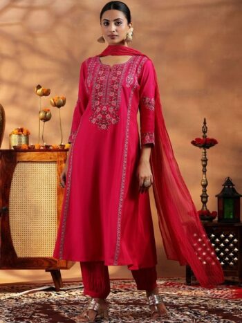Floral Embroidered Thread Work Notch Neck A Line Kurta with Salwar & Dupatta