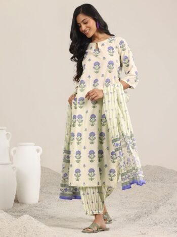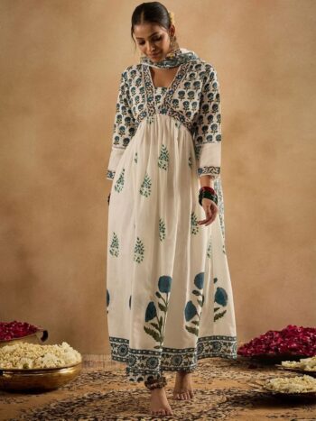 Floral Printed Empire Pure Cotton Anarkali Kurta With Trouser & Dupatta