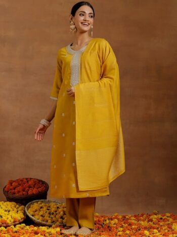 Floral Yoke Design Regular Zari Kurta with Trousers & Dupatta