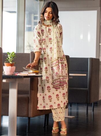 Off White Floral Printed Keyhole Neck Straight Kurta With Salwar & Dupatta