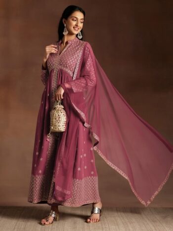 Mauve Ethnic Motifs Embroidered Mandarin Collar Georgette Sequinned A-Line Kurta Set