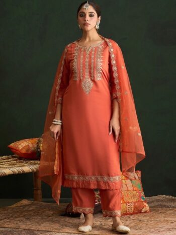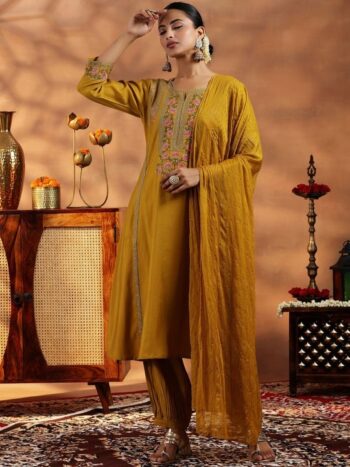 Floral Embroidered Thread Work Notch Neck A Line Kurta with Salwar & Dupatta