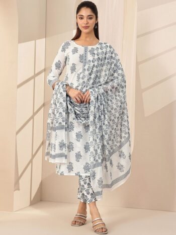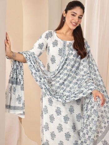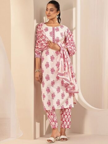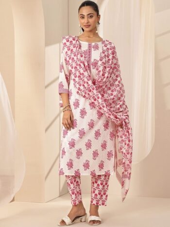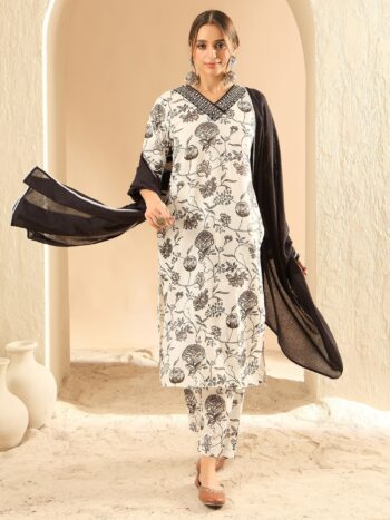 Floral Printed Embellished Pure Cotton Straight Kurta with Trouser And Dupatta
