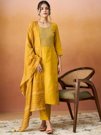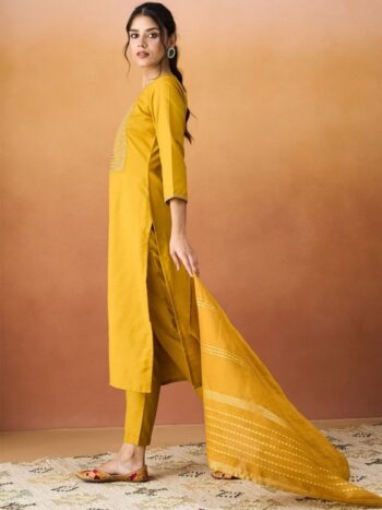 Ethnic Motifs Yoke Design Thread Work Straight Kurta With Trousers & Dupatta