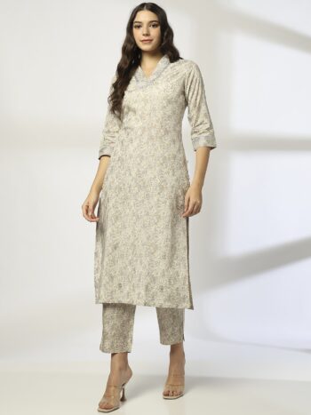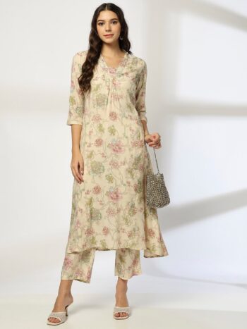 Cream Floral Printed Mandarin Collar Straight Kurta