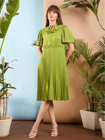 Flared Sleeves Frill Neck Accordion Pleated Fit & Flare Midi Dres