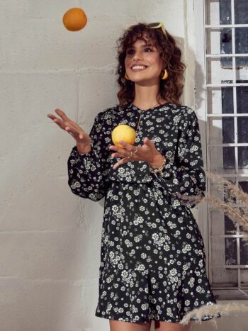 SASSAFRAS Black & White Floral Printed Puff Sleeves A-Line Dress