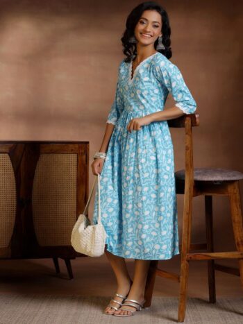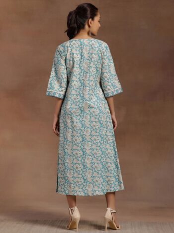 Ethnic Motif Print Mandarin Collar Short Puff Sleeves Cotton A-Line Midi Dress