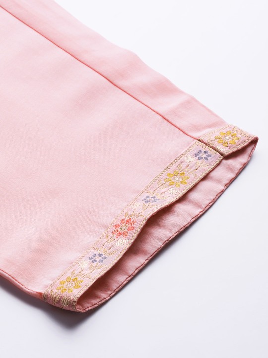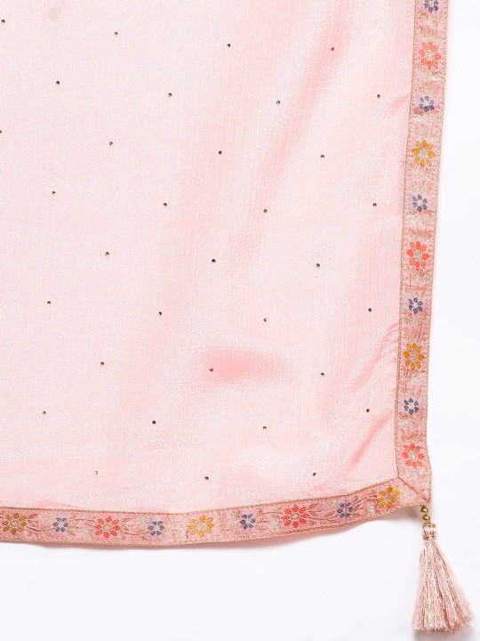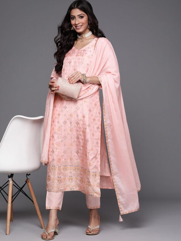 Our 3-piece pink woven design silk suit set features a straight-fit floral embroidery kurta with a V-neckline and three-quarter sleeves, straight pants with a partially elasticated waistband and roomy pockets, and a chiffon dupatta in a solid tone. Adorned with complementing fabric-trim detailing, Gota Patti accents on the yoke and sleeves, and delicate tassel details on the dupatta, this elegant style is ideal for festive occasions.