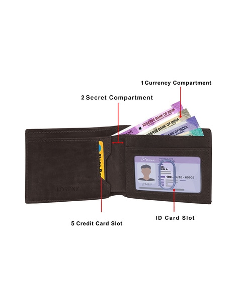 5 Credit Card Slots With Puller Strap, 1 Transparent Id Window, 2 Secret Compartment and 1 Currency Compartment.