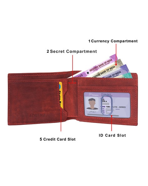 5 Credit Card Slots With Puller Strap, 1 Transparent Id Window, 2 Secret Compartment and 1 Currency Compartment.