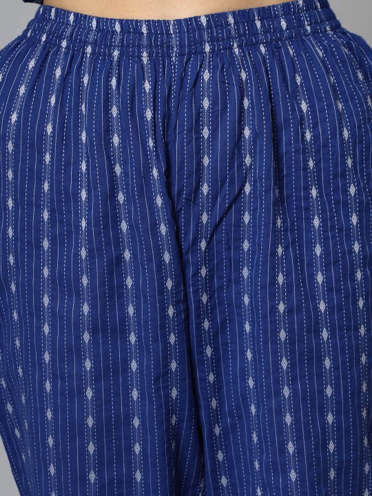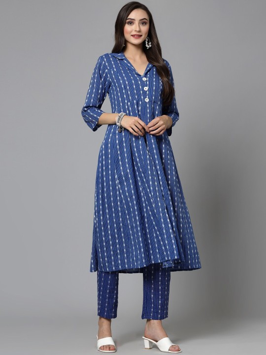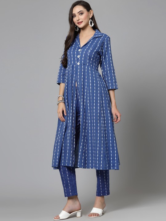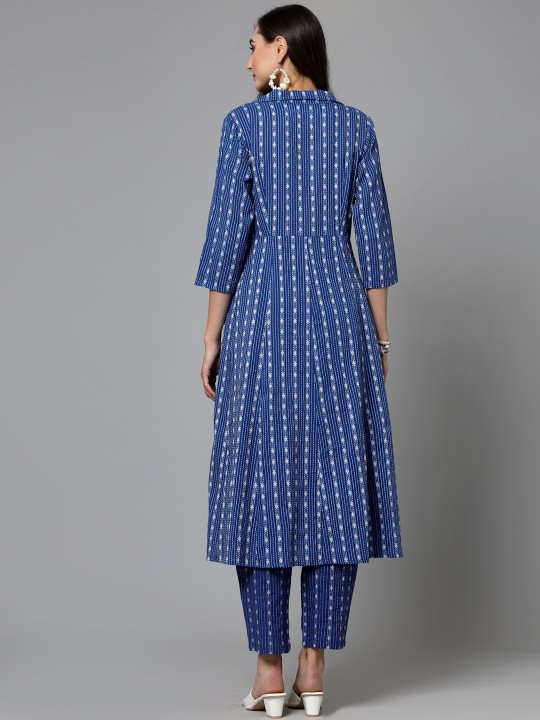 Blue Self Design Shirt Collar Pure Cotton Top & Trousers
