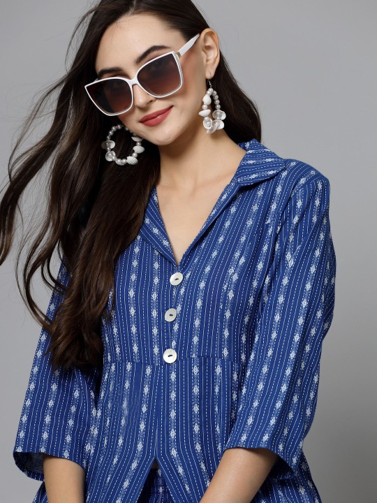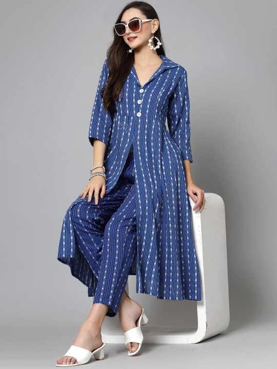 Be the first to review “Blue Self Design Shirt Collar Pure Cotton Top & Trousers”