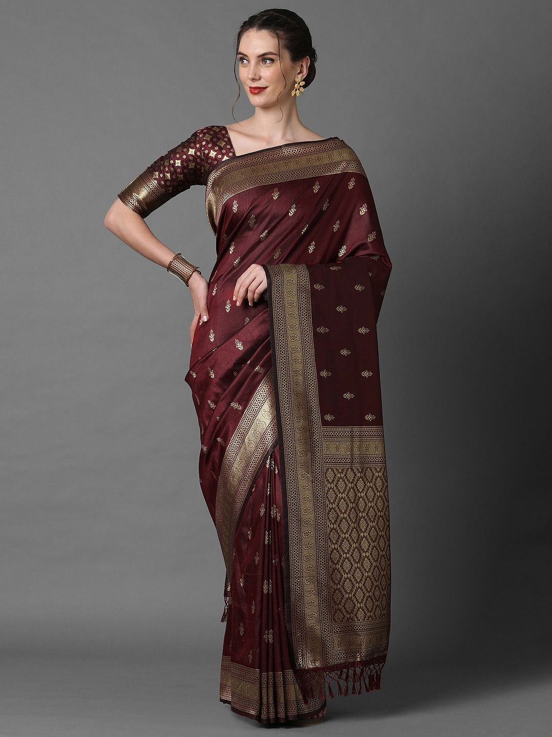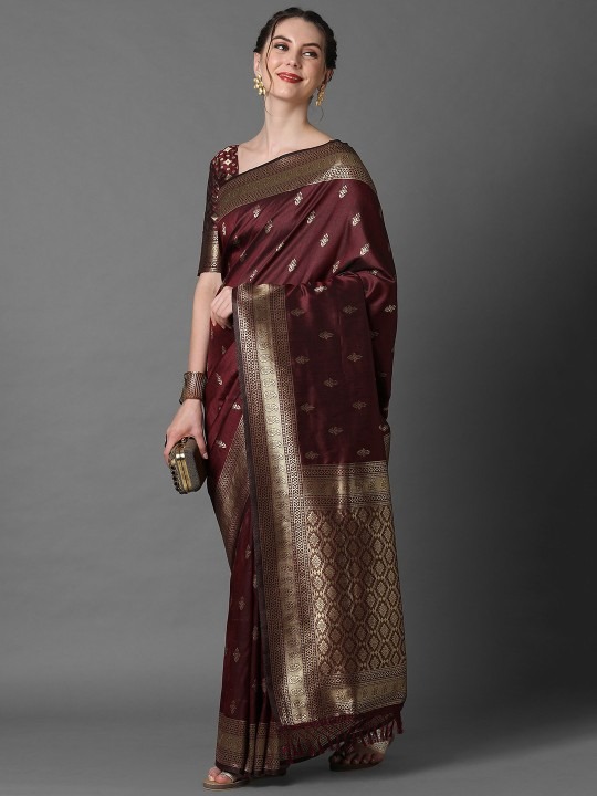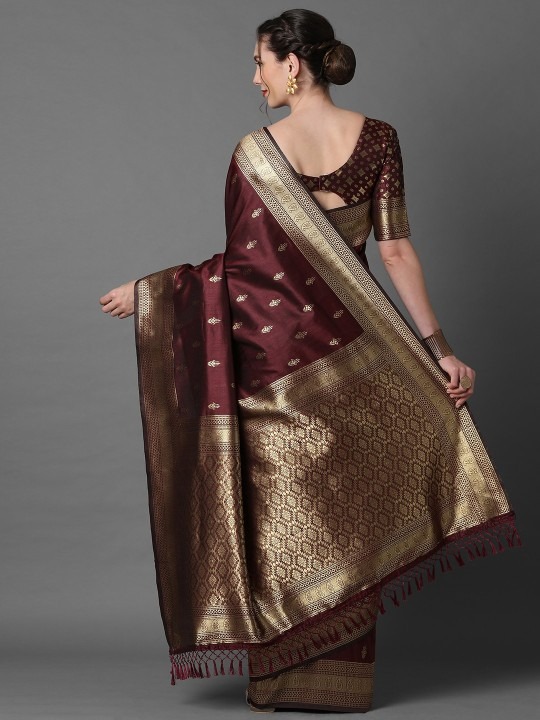 Brown & Gold-Coloured Ethnic Motifs Woven Design Silk Blend Banarasi Saree