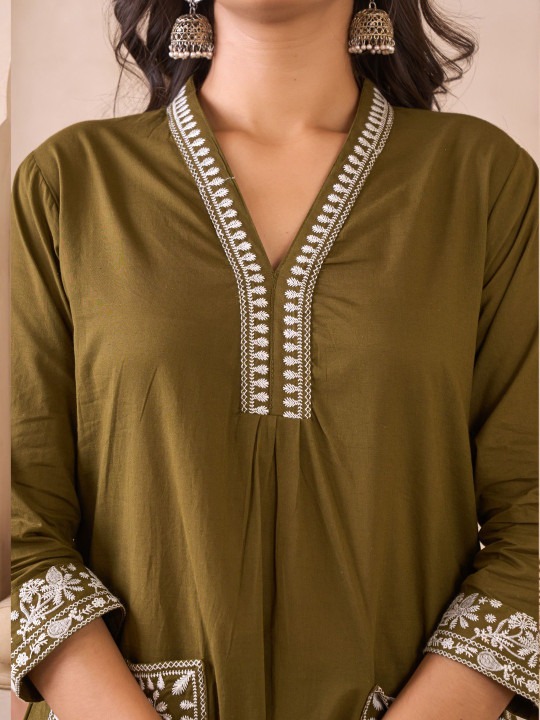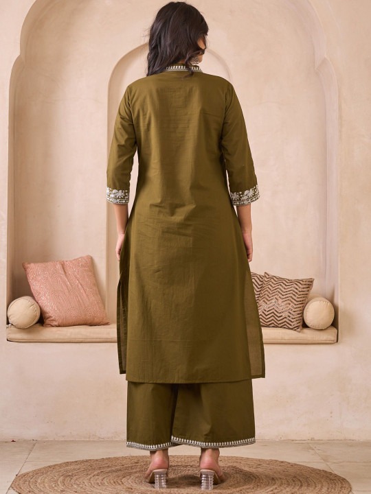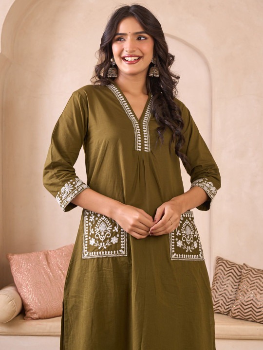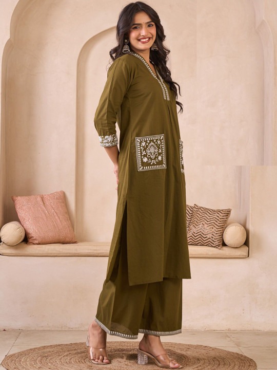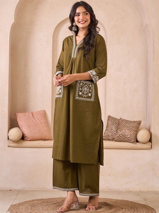 Embroidered Pure Cotton V-Neck Straight Kurta & Palazzos