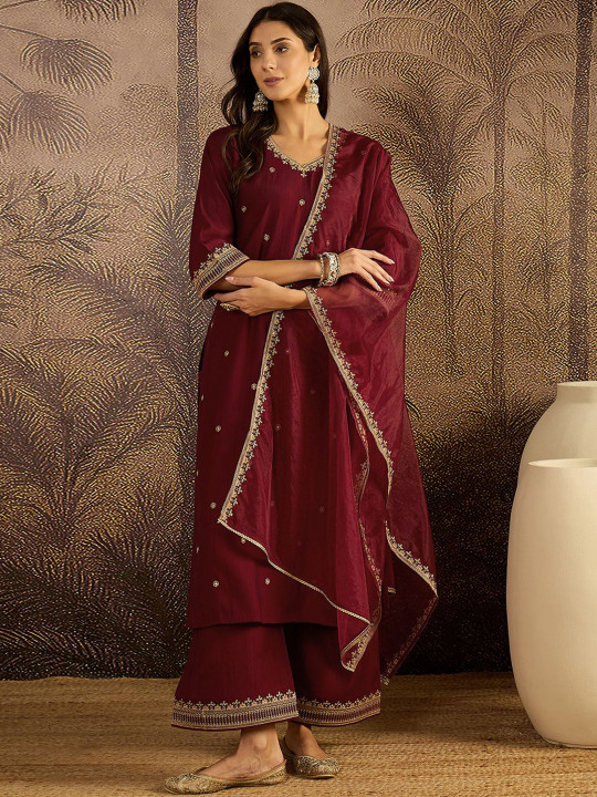 This kurta set consists of kurta, palazzos and dupatta