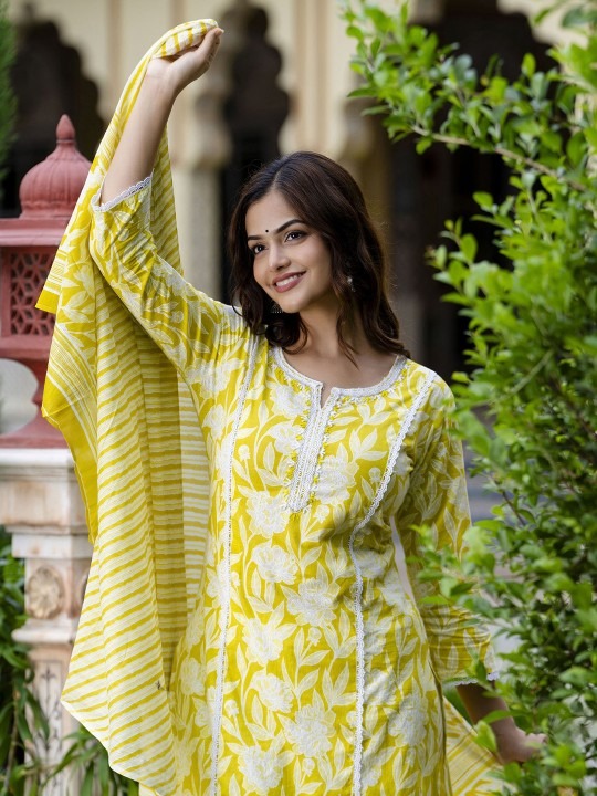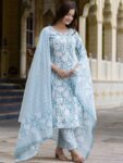 Floral Embroidered Regular Pure Cotton Straight Kurta with Trouser & Dupatta