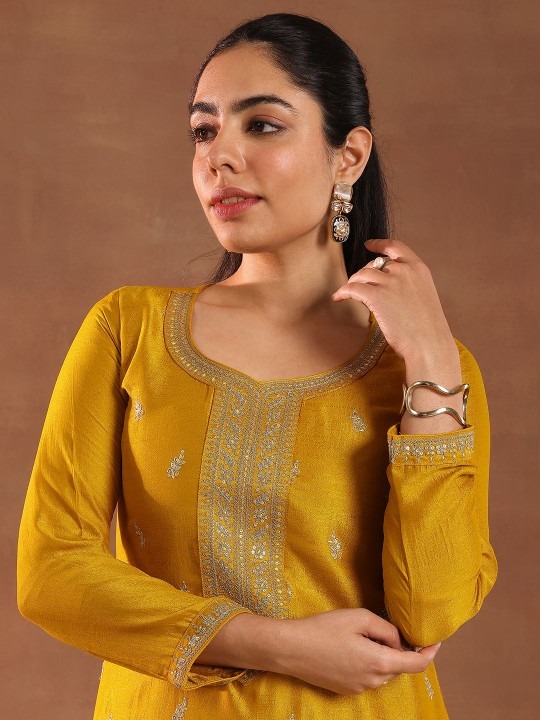 Mustard and gold-toned embroidered Kurta with Trousers with dupatta