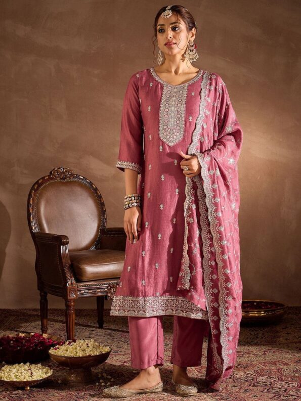 Floral Embroidered Thread Work Straight Kurta With Trousers & Dupatta