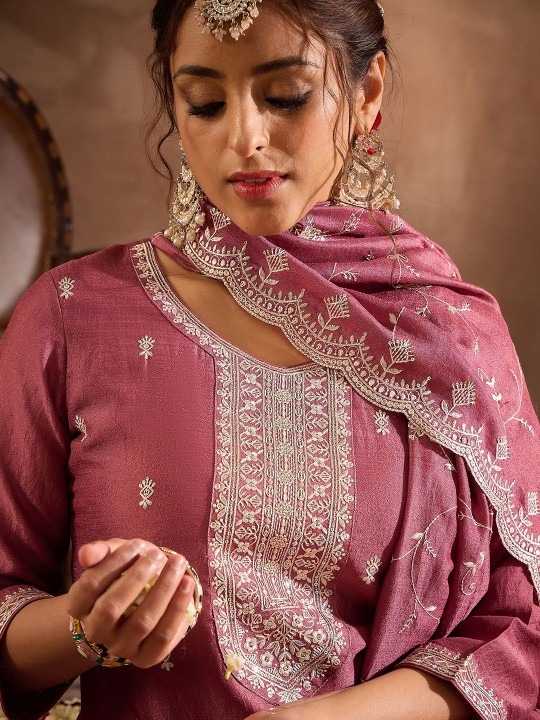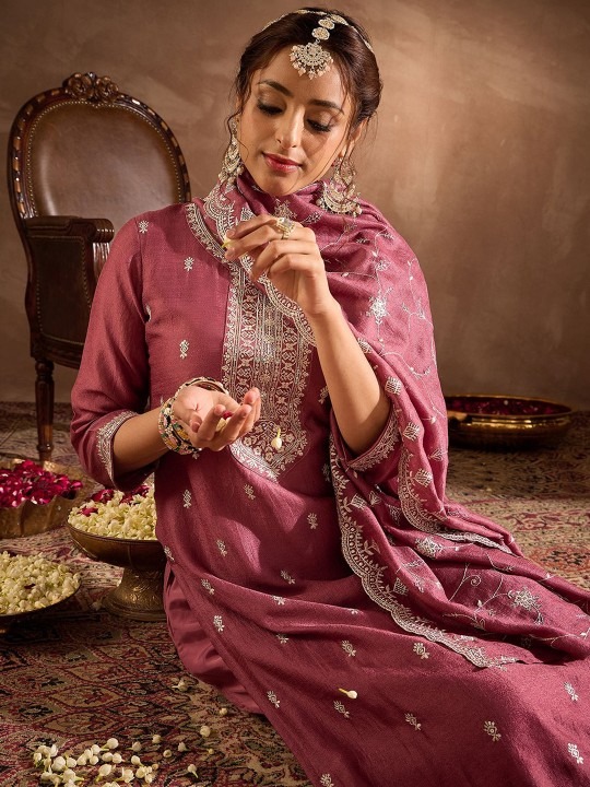 Mauve and gold-toned embroidered kurta with trousers and dupatta