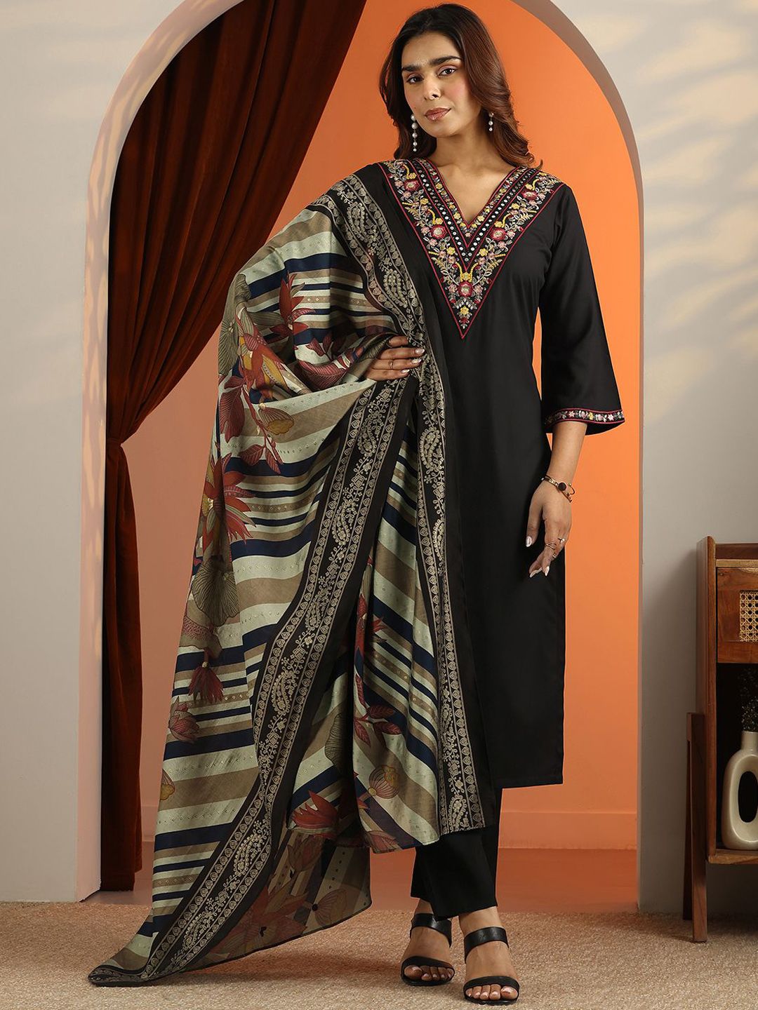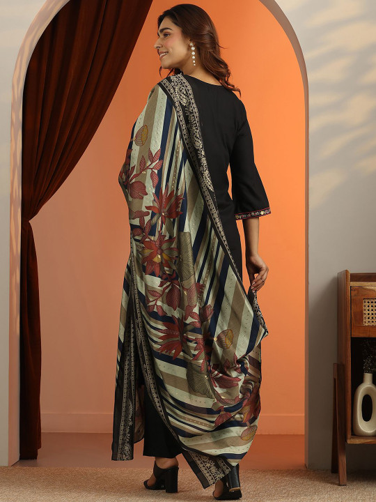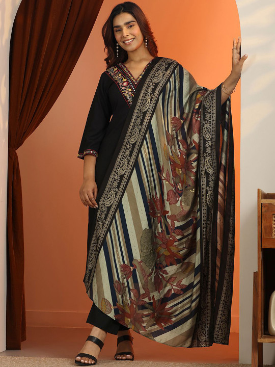 Floral Embroidered V-Neck Straight Kurta With Trousers & Dupatta