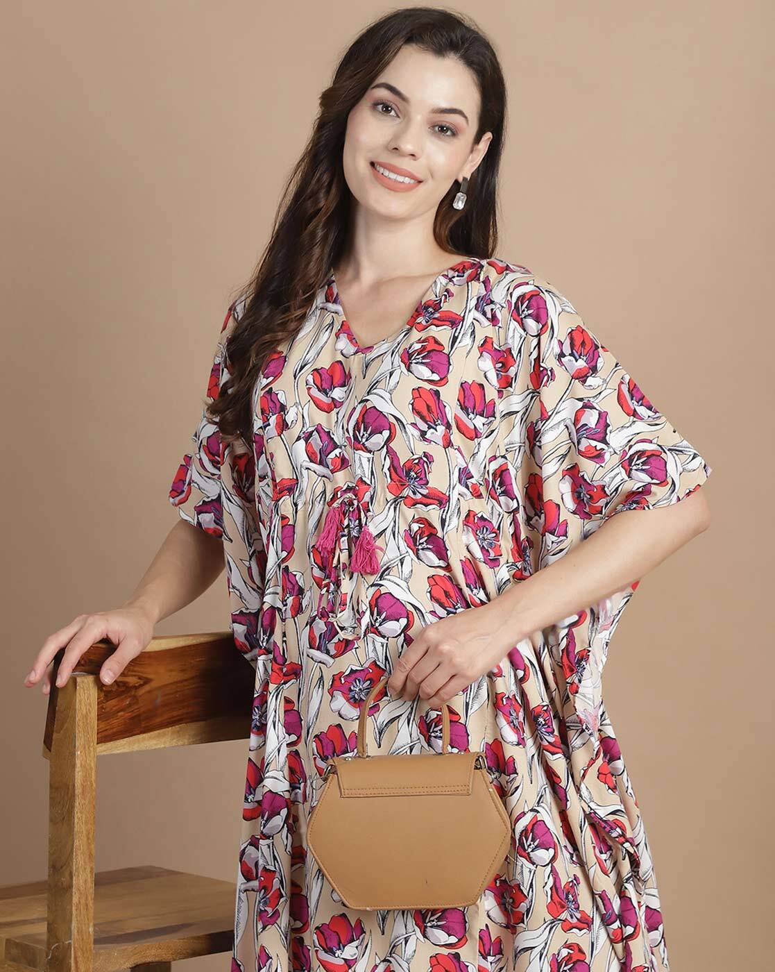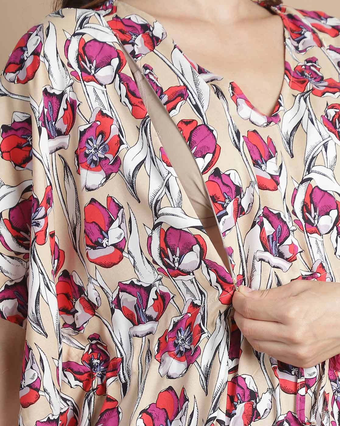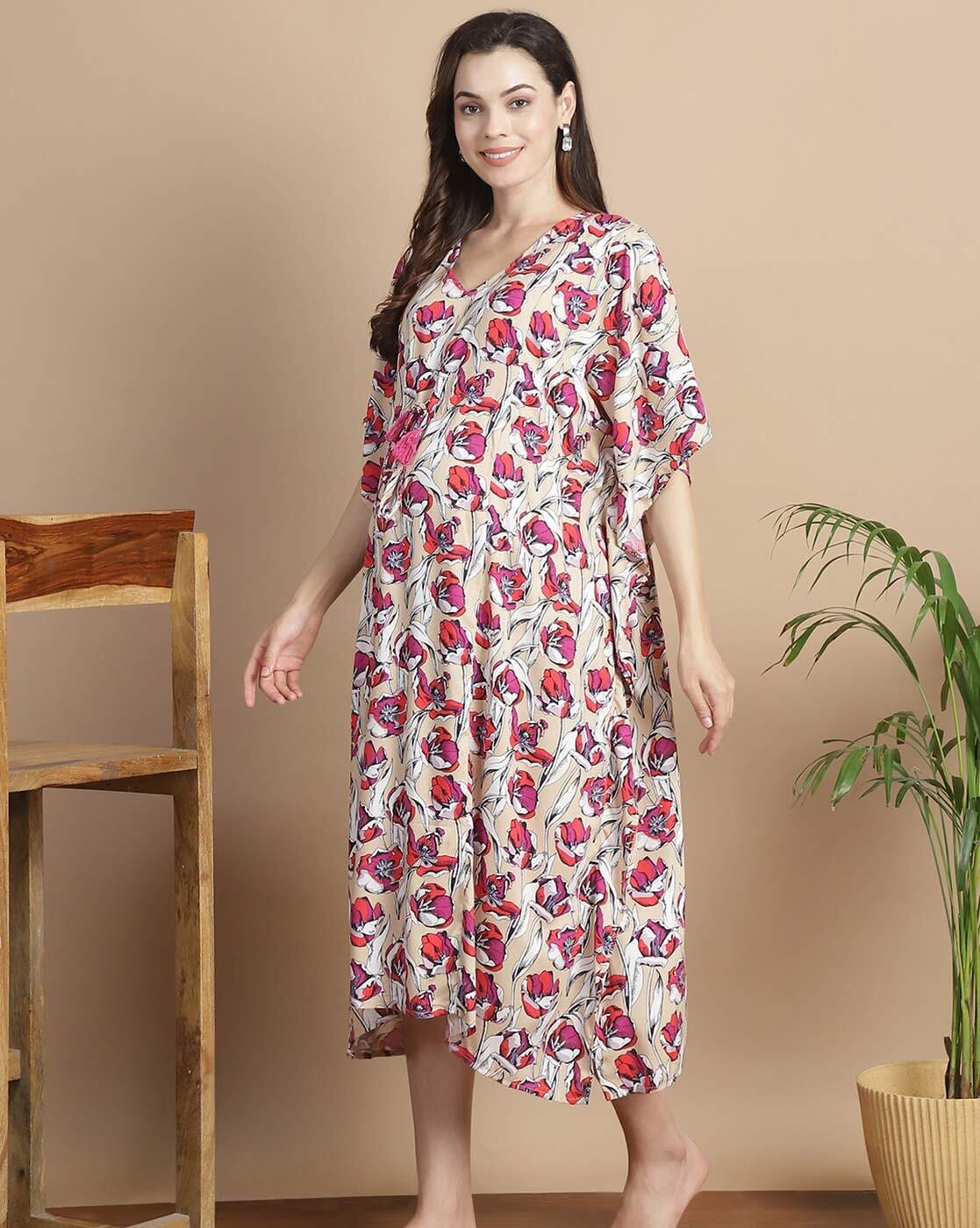 Easy Nursing Access: Discreet feeding zippers in this maternity kaftan nighty allows for effortless nursing access, while the inner flap ensures no irritation on the skin