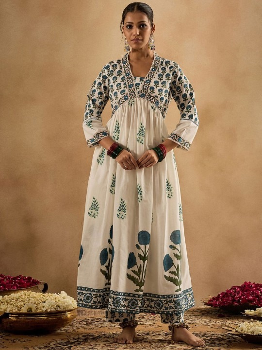 Floral Printed Empire Pure Cotton Anarkali Kurta With Trouser & Dupatta